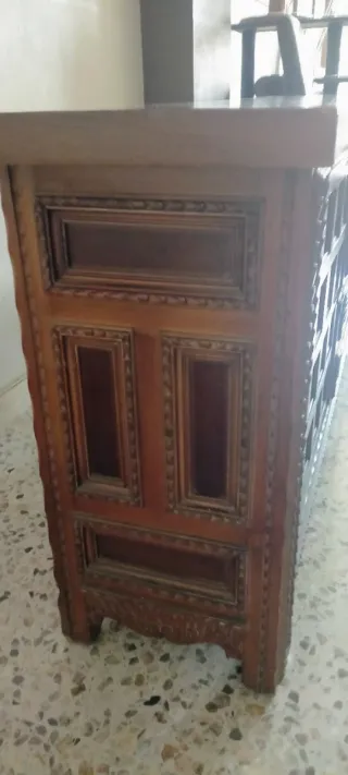 Mueble antiguo de madera oscura, ideal para la entrada de casa. Presenta un diseño clásico con detalles tallados. - Estructura de madera oscura. - Detalles tallados. - Incorpora un espejo.