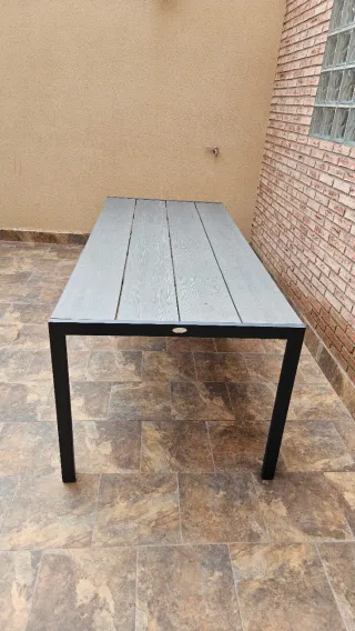 Mesa de exterior con estructura de aluminio y superficie de madera. - Medidas: 2.05 metros de largo por 90 cm de ancho. - Diseño moderno y resistente.
