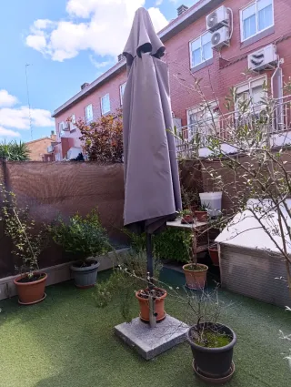 Sombrilla de jardín en color gris, ideal para exteriores.=60€ - Tela resistente. - Diseño plegable para fácil almacenamiento. + Base de granito=25€ Total=85€