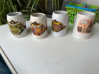 Conjunto de jarras de cerveza con diseños de escudos. - Cada jarra presenta un escudo distintivo. - Diseño clásico con asa. - Ideales para coleccionistas o para disfrutar de una bebida.