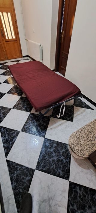 Cama plegable de 90cm, ideal para invitados o espacios reducidos. Se encuentra sin usar. Costó nueva 180€ y nunca se usó. - Estructura de metal. - Tapizado de tela.