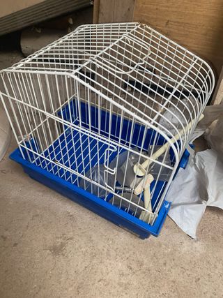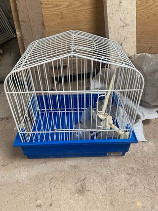 Jaula para pájaros con base azul y estructura blanca. Incluye accesorios. - Bandeja extraíble para facilitar la limpieza. - Comedero y bebedero incluidos. - Palo para posarse.