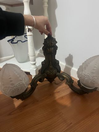 Elegante lámpara de pared con un diseño clásico y detalles ornamentales. - Estructura principal en acabado dorado. - Dos tulipas de cristal translúcido con relieve. - Ideal para añadir un toque de distinción a cualquier estancia.