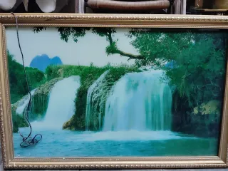Marco decorativo con una escena de cascada y luces integradas. Añade un toque natural a tu espacio. - Marco de color dorado. - Imagen de paisaje con cascada y vegetación. - Luces para realzar la escena.