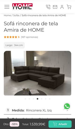Lo pedí a través de La Tienda Home. Al ser un sofá de gran tamaño y tela especial, lo consideran artesanal y no se puede devolver. Me llegó hace cuatro días y lo tengo en su embalaje original, ya que me equivoqué en las medidas. Como se ve en la foto, cuesta 1539€. Sus medidas también aparecen en la foto.