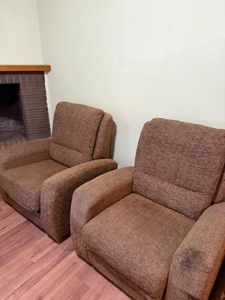 Conjunto de dos sillones tapizados en color marrón. Son sillones eléctricos. - Tapicería de tela. - Mecanismo eléctrico.