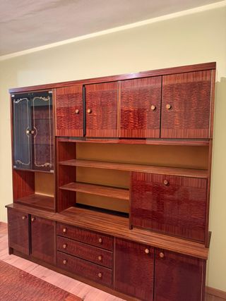 Mueble auxiliar de madera en estilo clásico con puerta de cristal decorada y baldas interiores. Ideal para vajilla, copas, libros o decoración. Acabado barnizado brillante a juego con el resto del mobiliario del salón. En buen estado general. Perfecto para salón tradicional o comedor.