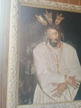 Marco de madera trabajado con una imagen de Jesucristo. - Marco con detalles dorados. - Imagen de Jesucristo con corona de espinas.