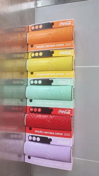 Conjunto de 5 vasos de Coca-Cola, edición limitada de 2025. Cada vaso tiene un color vibrante y un diseño único. - Incluye vasos en colores: morado, verde, amarillo, naranja y rojo. - Diseño con relieve de la marca Coca-Cola. - Cada vaso viene en su empaque original.