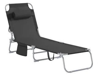 Tumbona plegable en color negro, ideal para exteriores. Incluye una almohada para mayor comodidad. - Estructura metálica. - Tejido de poliéster. - Almohada ajustable.