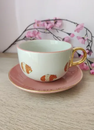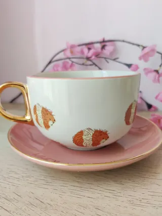 Taza y plato rosa dorado con conejillo de indias