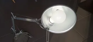 Lámpara de mesa con un diseño moderno y funcional. - Acabado plateado brillante. - Fabricada en metal resistente. - Brazo articulado para ajustar la posición.