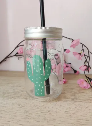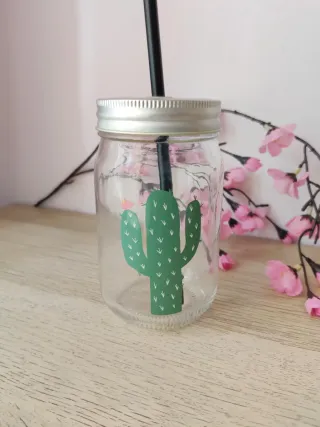 Vaso de Cristal con Cactus Tapa y Pajita