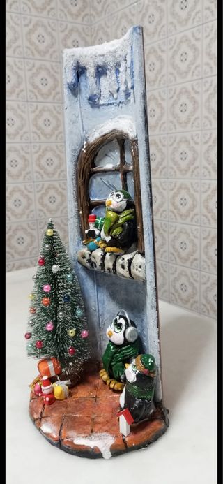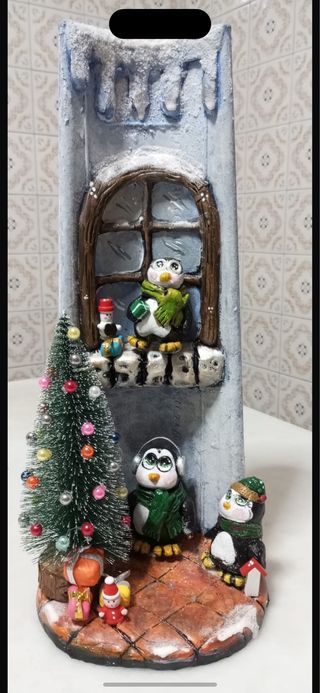 Adorno navideño con un diseño invernal encantador. Perfecto para dar un toque festivo a tu hogar. - Figuras de pingüinos con bufandas. - Árbol de Navidad decorado. - Base con detalles de nieve y ladrillos.