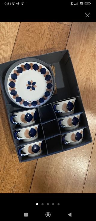 Elegante juego de café con leche de la marca Sargadelos modelo Follas, descatalogado, nuevo y en su caja. 6 tazas de café con leche, jarra de café, de leche y azucarero - Piezas con diseño de hojas en azul y detalles en marrón. - Incluye tetera, jarra, azucarero y taza con plato.