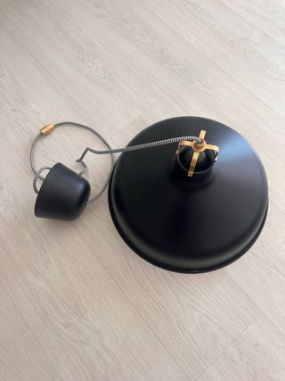 Elegante lámpara de techo colgante con un diseño moderno. - Acabado en color negro y detalles dorados. - Fabricada con materiales de calidad. - Marca Ikea “Ranarp”