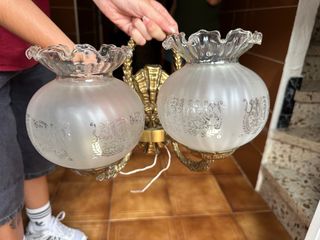 Preciosa lámpara de pared antigua de estilo vintage. Ideal para dar un toque clásico y elegante a tu hogar. - Dos brazos con tulipas de cristal opalino. - Diseño con detalles florales grabados. - Estructura de metal con acabado dorado.