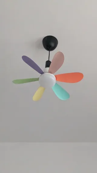 Lámpara ventilador con un diseño alegre y colorido. - Palas de ventilador en varios colores: verde, rosa y naranja. - Cuerpo central blanco con detalles morados y amarillos. - Cadena para encender/apagar y regular la velocidad.