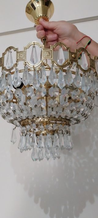Preciosa lampara con lagrinas de cristal de roca facetado, ideal para dar un toque de elegancia a cualquier espacio. Pesa 12/15 Kg. lleva varias bombillas en el interior del plafón, por lo que ilumina bastante. En perfecto estado de conservación, no le falta ninguna pieza ni tiene nada roto..