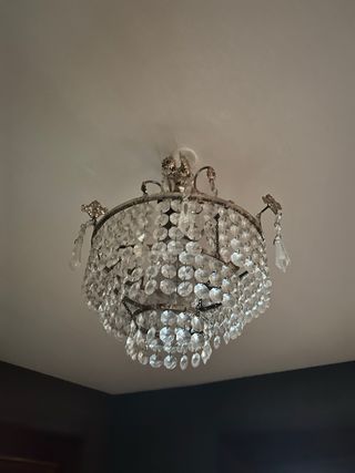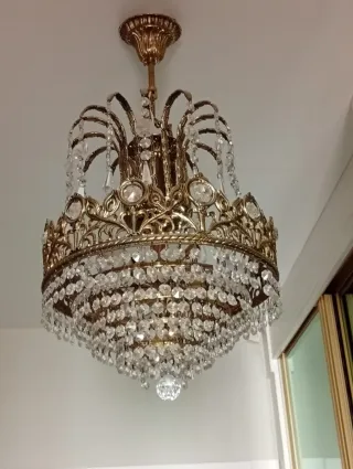 Lámpara de cristal de roca en perfecto estado. Se vende por cambio a ventilador. 38 cm de diámetro . 4 casquillos. No envíos, solo entrega en mano