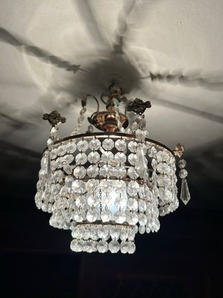 Preciosa lámpara techo Cristal roca, puntas imitación diamante vintage de 2 niveles, los cristales brillan con bonitos visos, largo total 72cm, diámetro de la parte superior 24.5cm con 2 luces, diámetro de la parte inferior 60cm, con 6 luces, casquillos e-27. Cuerpo bronce. Disponible en: 👍Cash Guay! tienda de segundamano, variedad de artículos, herramientas, electrónica, antigüedades, hogar etc... Visitanos en calle florencio llorente, 18, 28027. 👉Buscanos en Wallapop y marketplace como Cash Guay, descubre muchos artículos, nuevos y de segundamano garantizados. 😊Gracias por ver los anuncios! Envíos a consultar