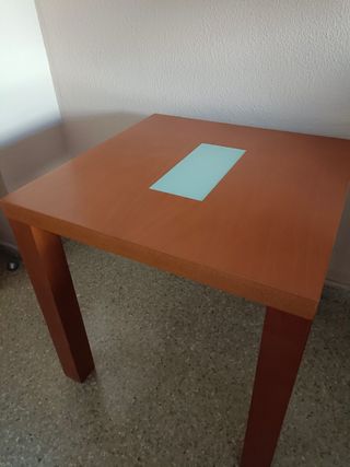 Mesa de madera chapada con cristal blanco en medio, la tapa tiene 4 cm de grosor. Tiene algunos roces que para verlos hay que buscarlos, pero los detallo en fotos con luz de noche y con la del día. Son superficiales propios de la lámpara de mesa y marco de foto que tenía puesto. Pesa bastante la tapa ya que es de madera chapada