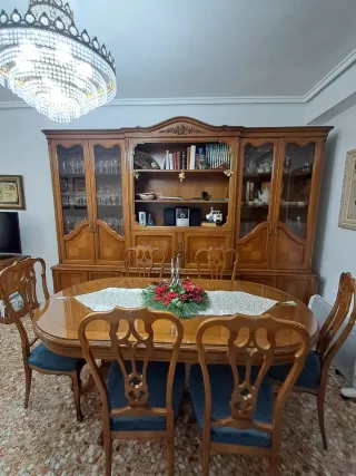 Conjunto de muebles de madera para salón comedor. Incluye mesa ovalada con sillas y vitrina. - Mesa de comedor ovalada (180x90). - Seis sillas con tapicería azul. - Vitrina de madera con puertas de cristal (230 alto x 3m ancho x 42cm profundo). - 2 sillones (70 ancho x 80 alto). - 2 mesas auxiliares (53 x 53). - Mesa pequeña central (105 x 55). - 2 lamparas de piedra de roca (60cm diametro). - Mueble auxiliar TV.
