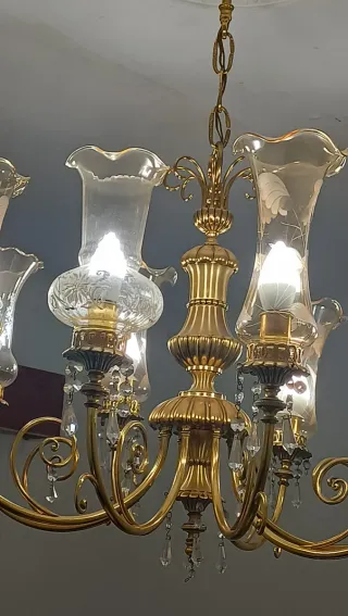 Elegante lámpara de araña con detalles en cristal y metal. - Diseño clásico con múltiples brazos. - Cristales colgantes que refractan la luz. - Base y estructura en tono dorado. Es bastante antigua, hay que re cablear y arreglar algunas cosas pero funciona