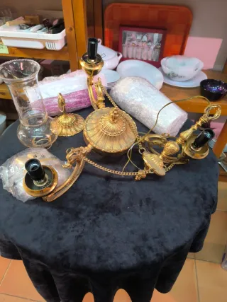 Elegante lámpara de araña con un diseño clásico y un acabado dorado que aporta un toque de distinción. - Detalles ornamentales. - Portalámparas con forma de vela. - Excelente calidad. Recogida en un pueblo de Ciudad Real, posibilidad de entrega en Madrid.