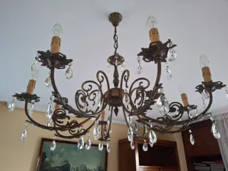 Elegante lámpara de araña antigua con detalles de cristal. - Estructura metálica con acabado envejecido. - Cristales colgantes decorativos. - Diseño clásico de época. Precio en conjunto: 250 euros Precio por unidad: 150 euros