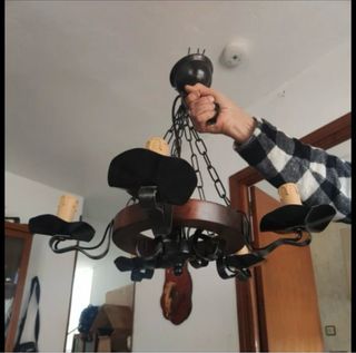 Preciosa lampara de techo de estilo rústico. Ideal para dar un toque antiguo a tu hogar. - Tiene 5 brazos con portalámpa. - La estructura es de metal negro y madera oscura.