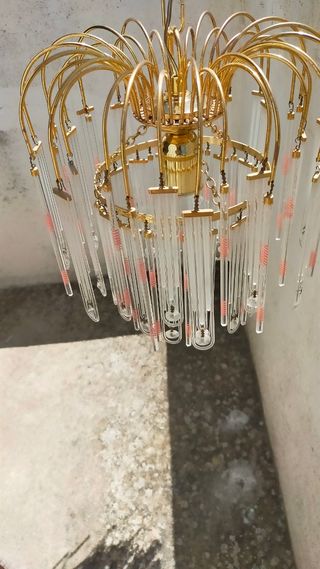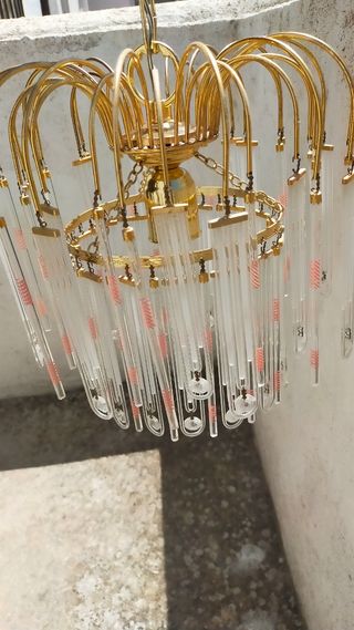 Elegante lámpara de techo vintage. Ideal para añadir un toque de sofisticación a cualquier espacio. - Diseño de araña con múltiples colgantes de cristal transparente. - Estructura metálica dorada en muy buen estado. - Los colgantes de cristal presentan detalles rosados.