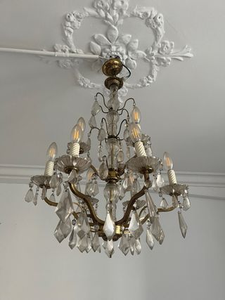 Elegante lámpara de araña de estilo antiguo. Su diseño combina detalles en cristal y metal dorado, aportando un toque clásico a cualquier espacio. - Estructura principal de metal dorado. - Elementos decorativos de cristal tallado. - Múltiples brazos con portalámparas.