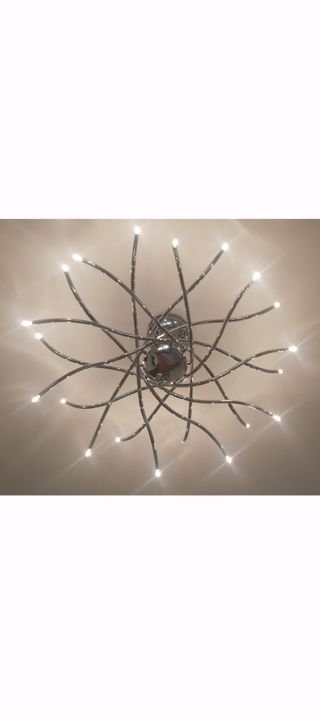 Elegante lámpara de techo con un diseño moderno y llamativo. - Estructura de metal con acabado plateado. - Diseño inspirado en una araña o estrella. - Múltiples brazos curvos con luces LED.