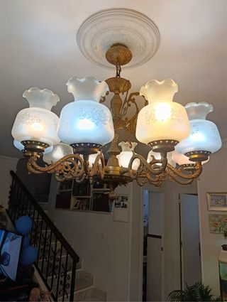 Vendo lámpara de techo antigua, de estilo clásico, fabricada en bronce, con cinco brazos y tulipas grandes de cristal transparente. Características: - Material: bronce - 5 brazos - Tulipas grandes de cristal todas intactas - Casquillo E27 - Diseño clásico, elegante y muy decorativo Estado: - Funciona correctamente - Bronce bien conservado, con signos normales del paso del tiempo y pátina natural - Sin piezas rotas ni faltantes Medidas aproximadas: - Diámetro: 65 cm - Altura: 80 cm