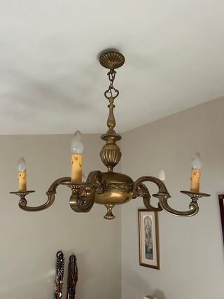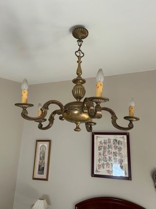Elegante lámpara de bronce con un diseño clásico y detalles ornamentales. - Estructura metálica con acabado dorado y detalles en madera. - Múltiples brazos para velas o bombillas.