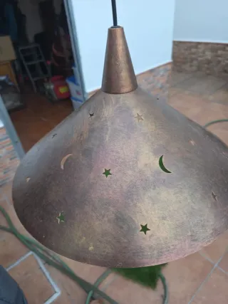 Lámpara colgante de metal con un diseño único. - Forma cónica. - Decorada con siluetas de estrellas y lunas. - Acabado en tonos bronce y dorado.
