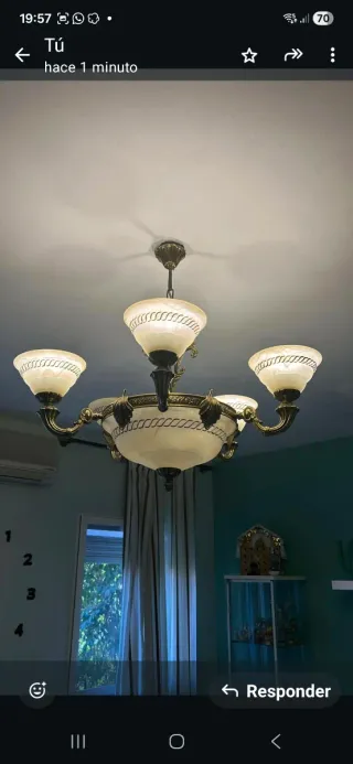 Elegante lámpara de araña con un diseño clásico y sofisticado. En muy buen estado Incluye elementos decorativos que puede ser mármol o piedra similar. - Acabado principal en tono dorado. - Detalles decorativos horneados - Estructura fabricada en metal bronce o similarSe puede recoger el navalmoral de la matamassa artículos en mi perfil