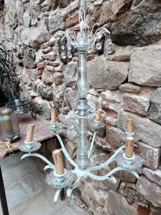 Elegante lámpara de estilo clásico, con un diseño que combina bronce y cristal. Ha sido pintada en un acabado blanco que le da un toque de distinción. Los sirios se tienen que pegar a la estructura, bombillas de rosca pequeña - Estructura principal de bronce. Le faltan algunos cristalitos. El alto es sin contar la cadena. - Detalles en cristal transparente. Entrego en mano