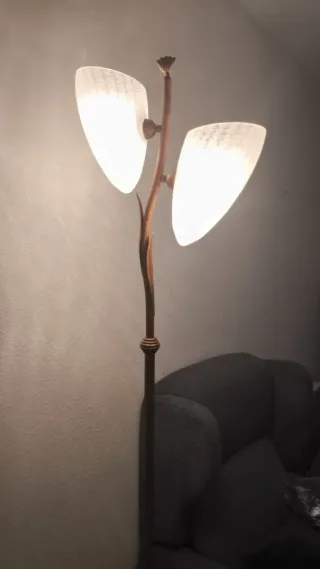 Elegante lámpara de pie con un diseño orgánico que evoca una rama. Sus pantallas de cristal translúcido difunden una luz cálida y acogedora. Es muy bonita, el entorno de la foto no la favorece en lo que es. Es una pieza unica - Estructura principal en metcon acabado bronze - Dos pantallas de cristal con textura. - Base estable.
