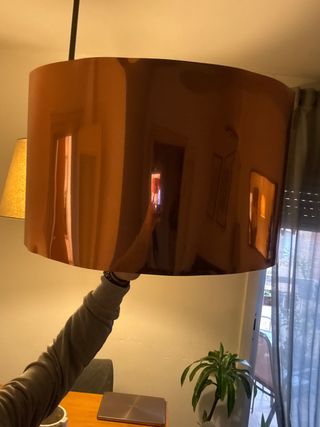 Pantalla para lámpara de pie con un acabado metálico en tono bronce y dorado. Su diseño cilíndrico y reflectante aporta un toque moderno a cualquier espacio. - Forma cilíndrica. - Acabado brillante. - diametro 50 cm