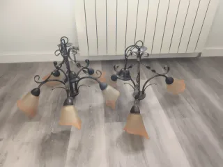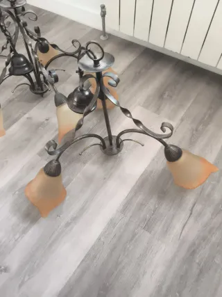 Conjunto de dos lámparas de estilo rústico con un diseño elegante. - Estructura principal en metal xolor bronce. - Tulipas de cristal con acabado anaranjado. - Detalle de espiral en los brazos. - Una es de tres brazos y la otra de 5