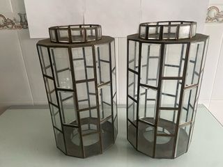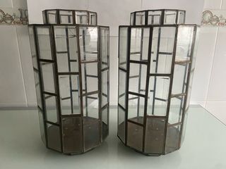 Elegante pareja de lámparas de estilo Art Decó con estructura de latón y detalles en bronce. Su diseño octogonal y los paneles de cristal crean un juego de luces único. - Diseño octogonal. - Paneles de cristal. - Acabado en latón y bronce. Med. 45x23 cm En una de las lámparas se aprecian dos cristales quebrados
