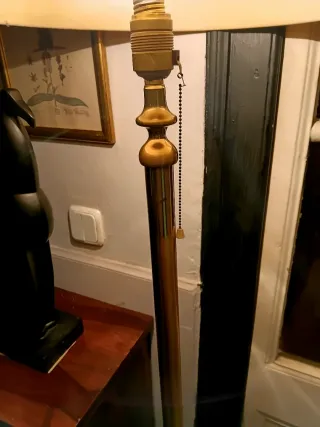 Lámpara de pie de estilo clásico / vintage. Fabricada en metal no magnético (probablemente latón o bronce). ✔️ Altura regulable mediante pomo en el mástil ✔️ Foco orientable con articulación y tornillo ✔️ Base maciza con relieves ornamentales, muy estable ✔️ Pantalla de tela color beige ✔️ Interruptor integrado en el cuerpo ✔️ Funciona correctamente Pieza con pátina original y marcas del paso del tiempo, propias de su antigüedad, que le dan carácter. 📏 Medidas: Altura regulable: 150–170 cm Ancho máx.: 45 cm Base: 25–30 cm Ideal para salón, rincón de lectura, despacho o ambie