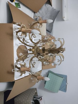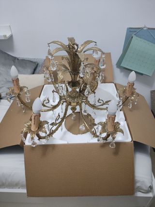 Preciosa lámpara de araña de estilo clásico. Es de color dorado y está fabricada con cristal y metal. - Tiene cinco brazos con candelabros. - Incluye cinco bombillas. - Elegante y vistosa.