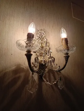 Elegantes apliques de pared con un diseño vintage. Aportan un toque de distinción a cualquier estancia. Bronce y cristal tallado - Estructura principal en metal dorado. - Detalles decorativos en cristal tallado. - Dos puntos de luz por aplique.