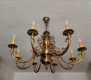 Lámpara de araña antigua de bronce macizo, estilo barroco, con 12 luces. Pieza elegante y ornamental, ideal para salones y espacios clásicos. Muy buen estado de conservación, propio de su antigüedad. (Medidas aproximadas)
