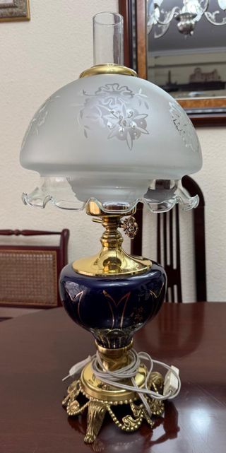 Elegante lámpara de mesa con base de cerámica azul cobalto y detalles en bronce. Su pantalla de cristal esmerilado presenta un delicado diseño floral. - Base de cerámica con acabado brillante. - Detalles ornamentales en metal dorado. - Pantalla de cristal esmerilado con grabado floral. - Tubo de cristal transparente.