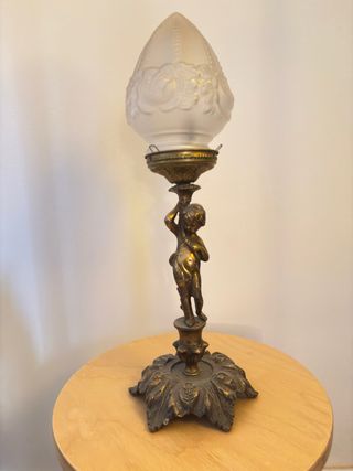 Elegante lámpara de mesa vintage con figura de angelito. - Base decorativa con motivos vegetales. - Figura central de bronce con pátina dorada. - Pantalla de cristal translúcido con relieve floral. - Hace falta poner el cable para la luz y la bombilla