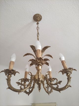 Preciosa lámpara de techo antigua de bronce...con un diseño elegante y clasico...cuenta con 6 brazos y seis casquillos E27...con su cadena original y gancho para colgarla del techo...funciona perfectamente...pesa bastante, unos 15kg...con un diametro aproximado de 80 cm.